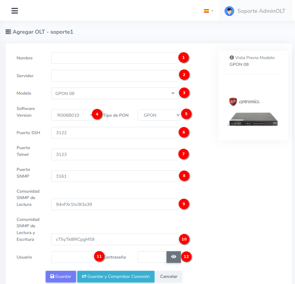 - Nombre: Se refiere a como nombrara a su OLT en el sistema AdminOLT. Este es definido por usted y no afectará a la conexión.