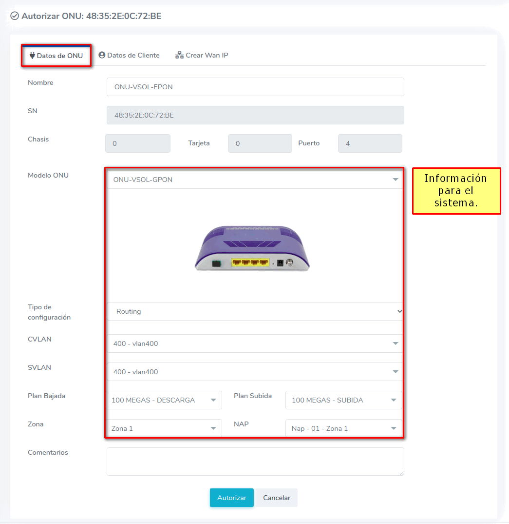 Por el momento no se puede crear la WAN desde Autorizar ONU dado que tenemos que esperar que la OLT configure correctamente la ONU, para crear una WAN IP al momento de autorizar, se recomienda leer el siguiente manual que habla sobre el tema más a fondo; Configuración WAN IP VSOL EPON