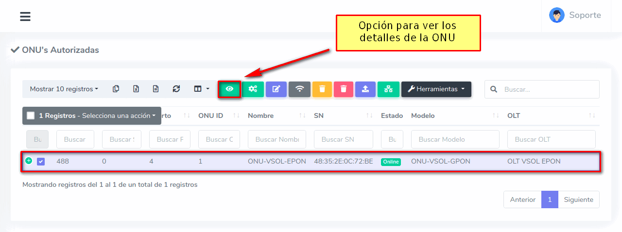 1Para ver los dispositivos que aún no han sido autorizados debemos dirigirnos a la sección ONU > Sin Autorizar y seleccionar alguna ONU disponible.