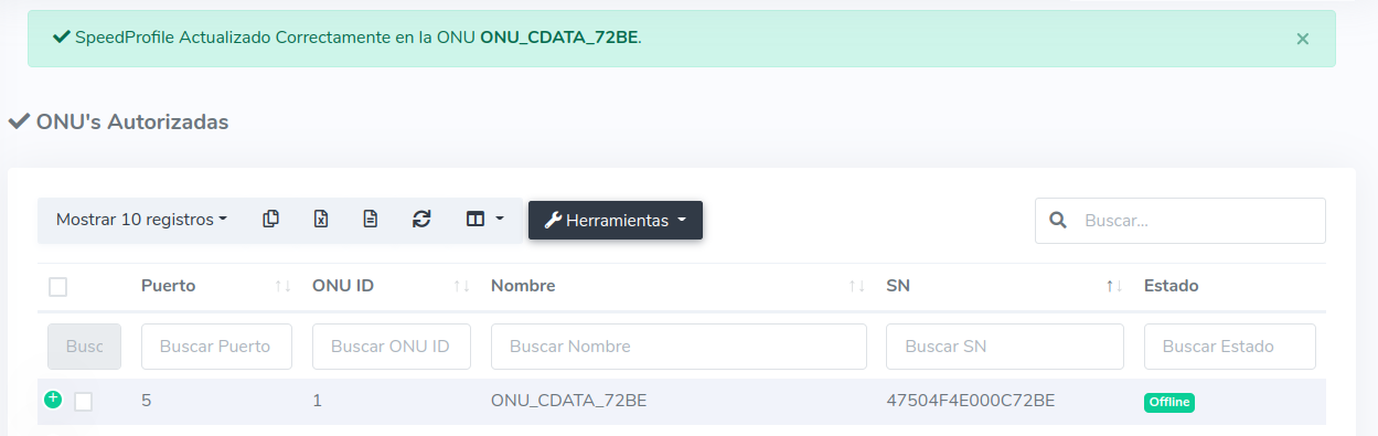 Para este ejemplo usaremos una ONU Autorizada que inicialmente tiene un Plan de 100 Megas, en este caso nosotros lo cambiaremos a un Plan de 25 Megas.