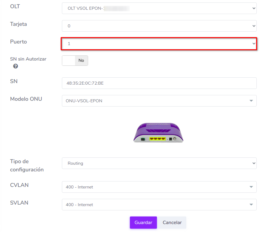 Cambiar ONU Vsol EPON de Puerto