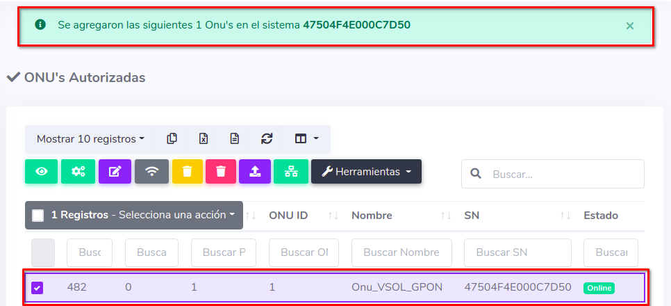 3Una vez que hayamos seleccionado los equipos, importamos las ONU's al sistema AdminOLT