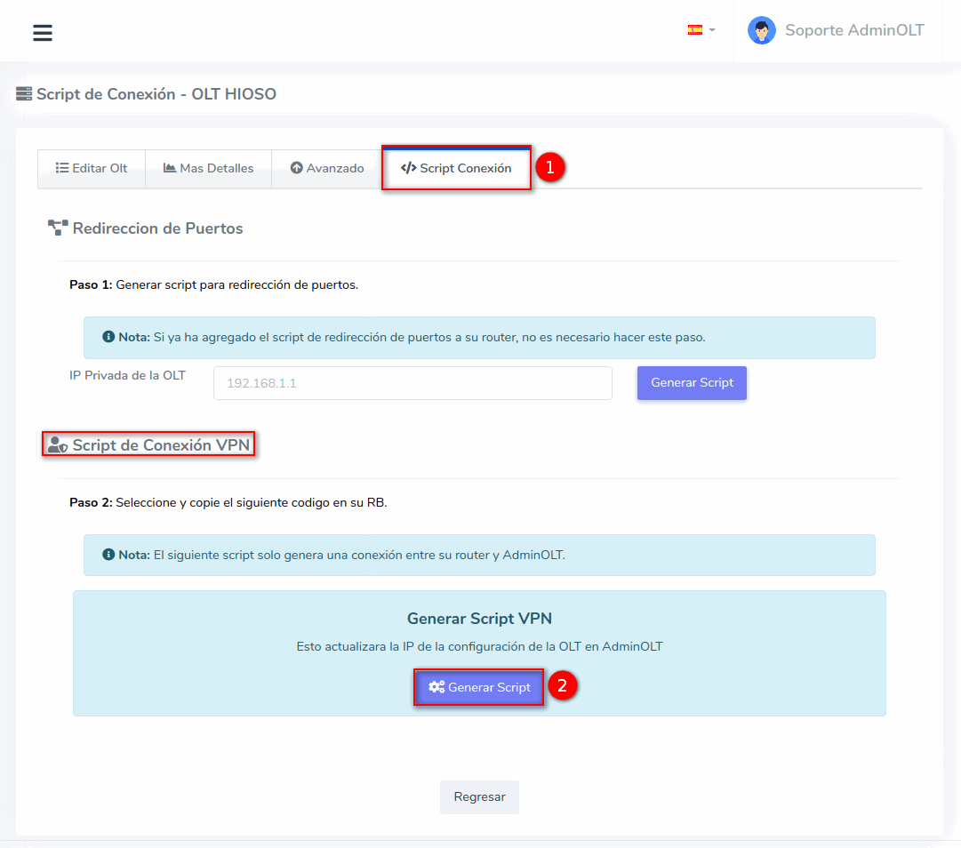 4 En la terminal de su Routerboard pegamos el script generado por AdminOLT y verificamos la conexión.