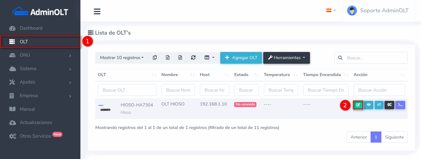 1 En la Lista de OLT's seleccionamos el equipo que deseamos conectar. La OLT ya debe estar registrada en AdminOLT.