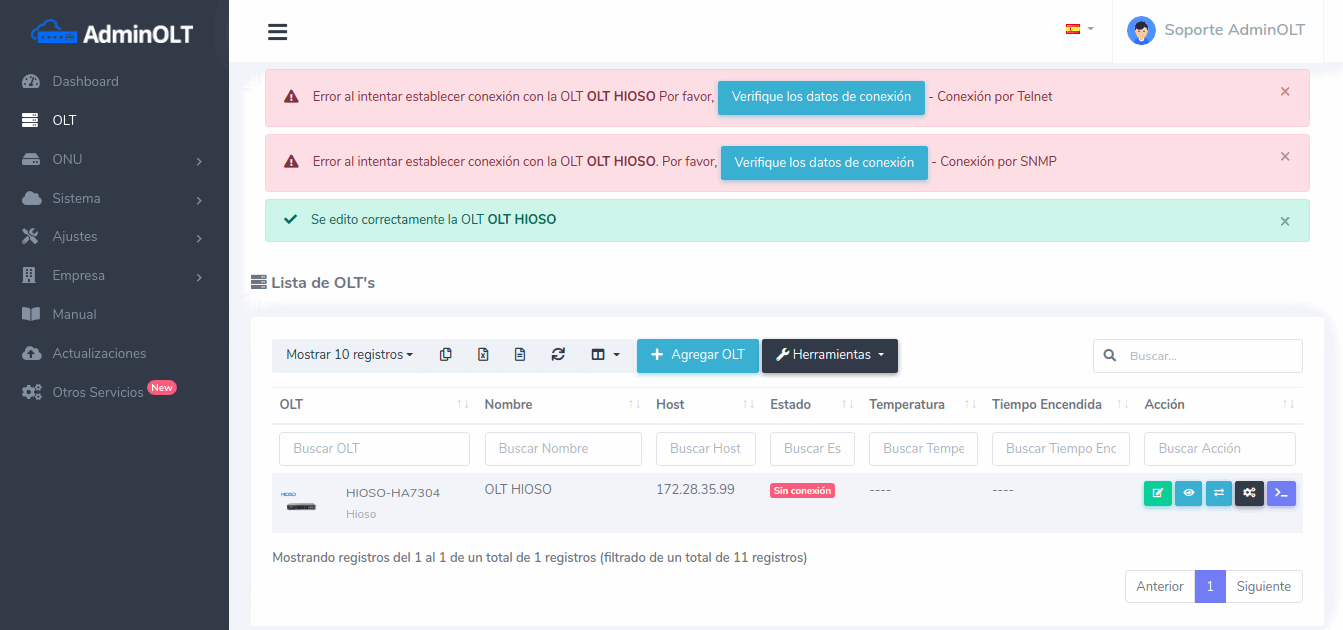 5 Verificar la conexión de su OLT en AdminOLT (en caso de que no haya conexión por SNMP y Telnet es porque su OLT aún no cuenta con las configuraciones iniciales).