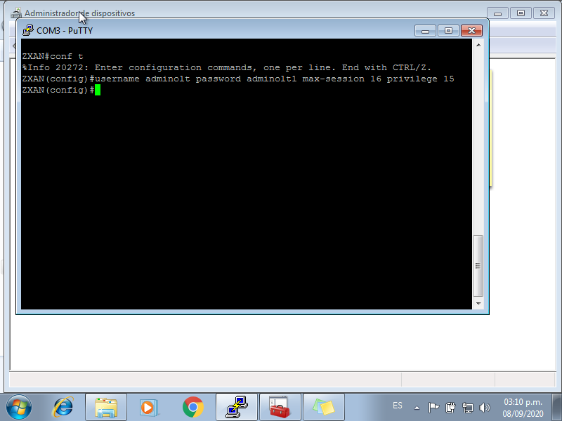 2 Debe verificar en que puerto COM se ha conectado la OLT. Para ello debe ingresar al Administrador de dispositivos de Windows y ubicar la parte de Puertos (COM Y LPT). Ahi se mostrará en que puerto se ha asignado. Para este ejemplo, fue en el puerto COM3