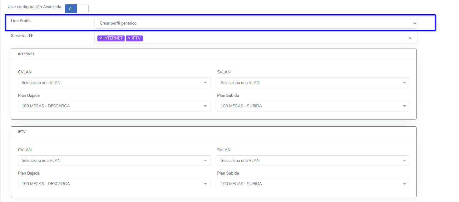 - Servicios: relacionado al Line Profile seleccionado, si se selecciona "Crear perfil generico" podrá escoger entre los diferentes tipos de servicios disponibles (INTERNET, IPTV, VOIP, NMS)