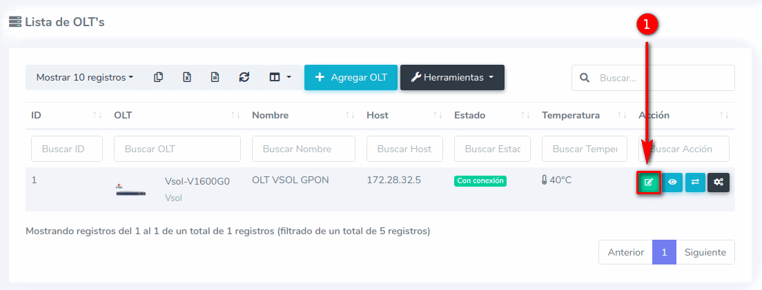 1 Para poder establecer la conexión de manera exitosa es necesario que generemos un script, para poder generarlo, nos dirigimos a nuestra OLT y seleccionamos la opción de editar.