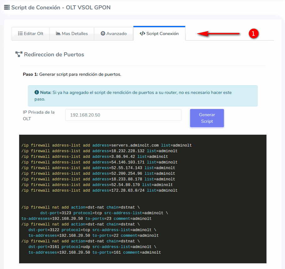 2Aqui ingresaremos nuestra ip privada y seleccionamos la opcion Generar Script. A continuacion veremos que se nos proporciona un Script.