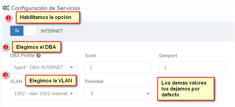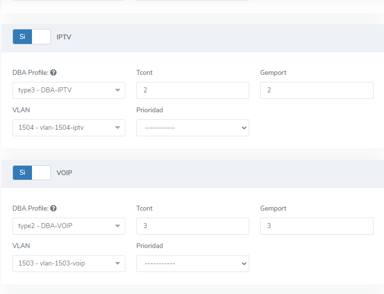 Es necesario que configuremos las VLAN de servicio que hemos creado en los puertos de nuestra onus. De esa forma, podemos designar los puertos de internet, VoIP y el de IPTV