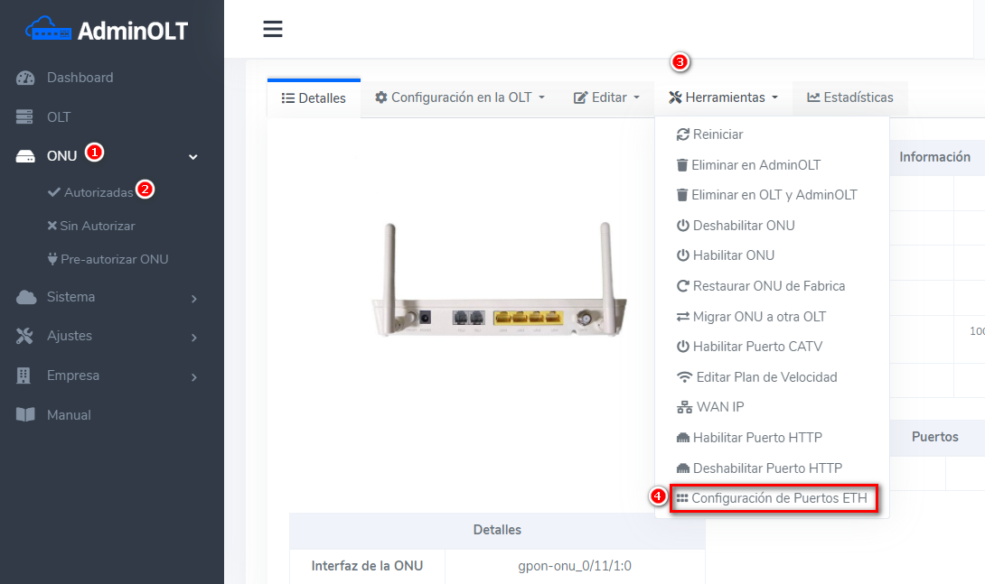 Como primer punto, seleccionamos la onu que autorizamos y vamos a la opción de configurar puertos ETH
